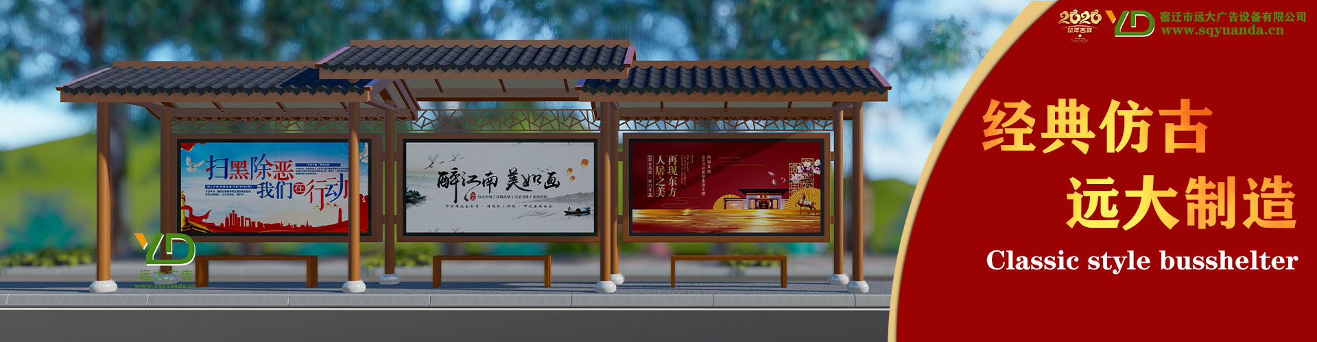 宿遷市遠(yuǎn)大廣告設(shè)備有限公司是一家專業(yè)生產(chǎn)公交候車(chē)亭,公交站臺(tái),閱報(bào)欄,指路牌,廣告垃圾箱,滾動(dòng)換 畫(huà)燈箱等系列產(chǎn)品廠家!產(chǎn)品多達(dá)上百種,亦可根據(jù)客戶的需求加工制作。